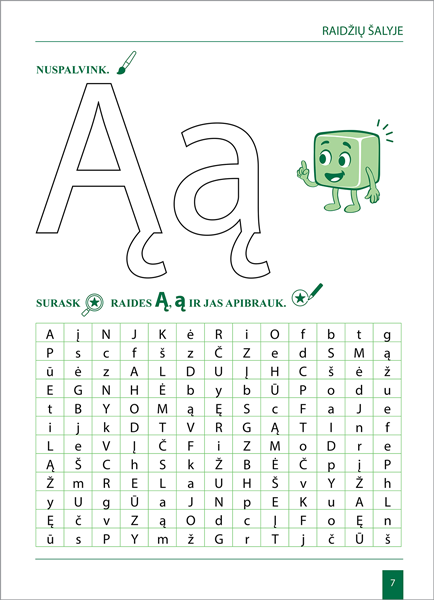 • Skatinti dėmesingumą ir pastabumą – užduotys reikalauja surasti ir nuspalvinti tam tikras raides žodžiuose;